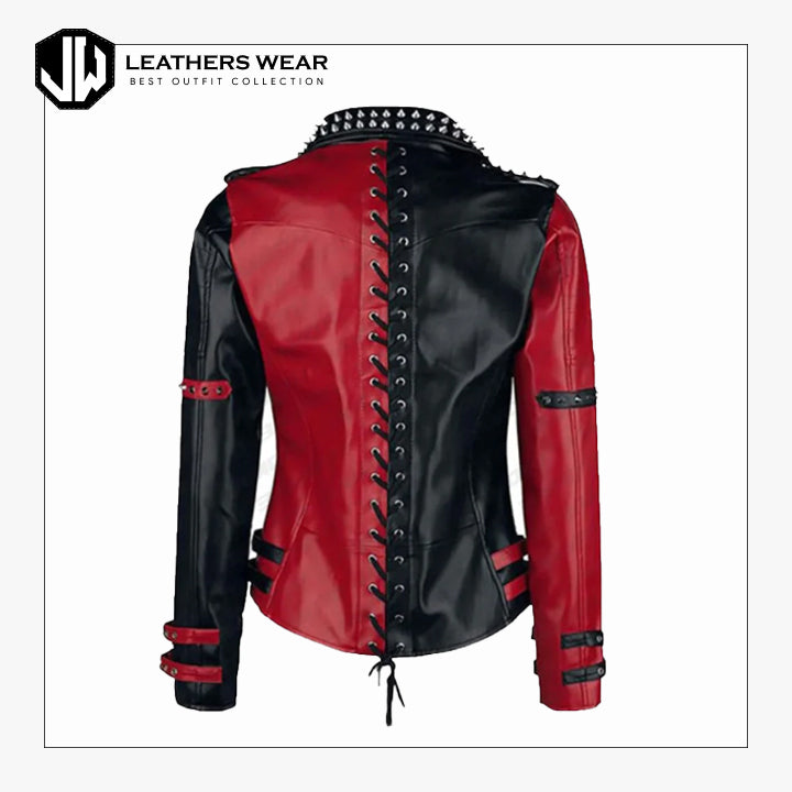 تألقي بإطلالة جريئة مع جاكيتنا الجلدي النسائي المرصّع بالمسامير . مصنوع من جلد أصلي فاخر، يتميز هذا الجاكيت بزخارف أنيقة تضفي لمسة من الرقي والتميز. مصمم لمن يعشقن التميز، فهو يجمع بين التصميم الكلاسيكي لراكبي الدراجات النارية والمظهر العصري والأنيق.