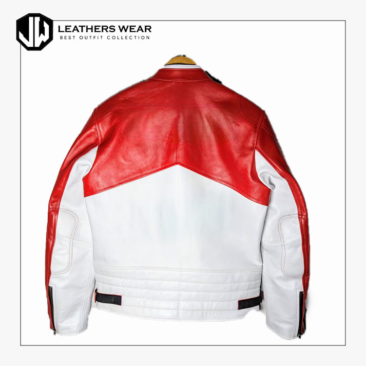سترة راكبي الدراجات النارية الجلدية باللونين الأحمر والأبيض