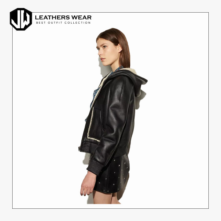 جاكيت نسائي من الجلد بغطاء للرأس من فرو الماعز