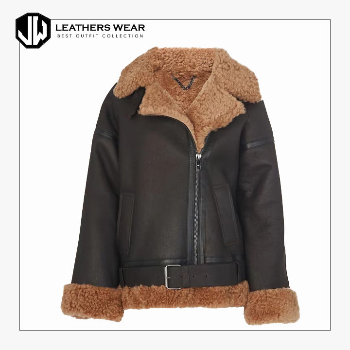 تألقي بإطلالة جريئة مع جاكيت الدراجات النارية النسائي المصنوع من جلد الغنم. مصنوع من جلد غنم فاخر ومبطن بالكامل بفرو ناعم وعازل، يجمع هذا الجاكيت بين التصميم العصري لأسلوب راكبي الدراجات النارية الكلاسيكي ودفء وراحة جلد الغنم الأصلي. مثالي للطقس البارد دون المساومة على أناقته.