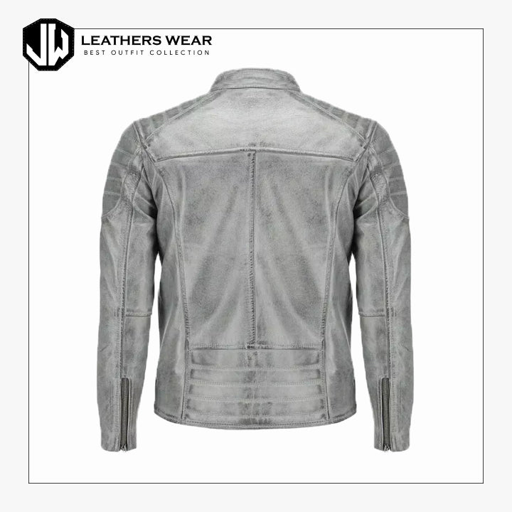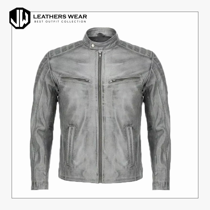 Perfect for both casual and motorcycle riding, the Gray Distressed Lambskin Motorcycle Jacket gives you the confidence to hit the road in style.