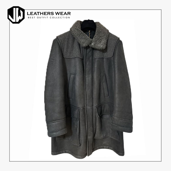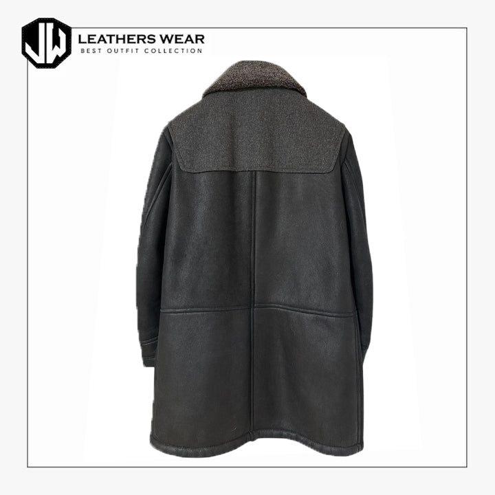 Embrace timeless elegance with our Long Leather Shearling Coat, expertly crafted from 100% genuine sheepskin leather and lined with plush shearling for superior winter warmth. Designed for men who value both fashion and function, this coat features a long overcoat silhouette, wide shearling lapel collar, button-front closure, and deep side pockets.