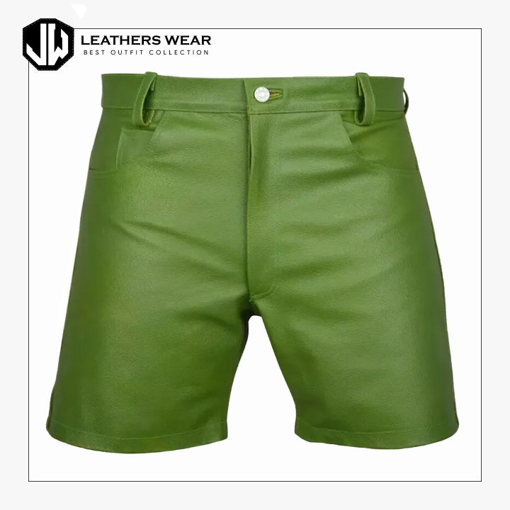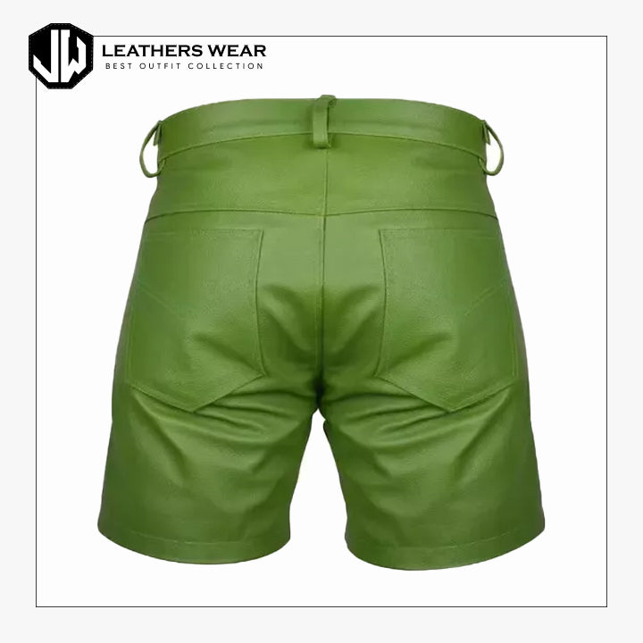 Stand out with our Mens Green Cow Leather Shorts, crafted from high-quality cowhide leather for unmatched durability and style. The bold green color and sleek design make these shorts a perfect choice for casual outings, festivals, or creating a unique fashion statement.