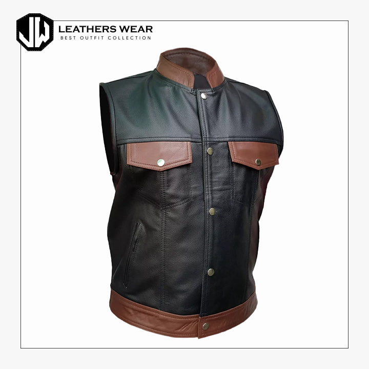 Add a touch of sophistication to your wardrobe with the Mens Pure Black and Brown Leather Vest. Designed for modern style and unmatched durability, this vest is perfect for bikers and casual fashion enthusiasts alike.