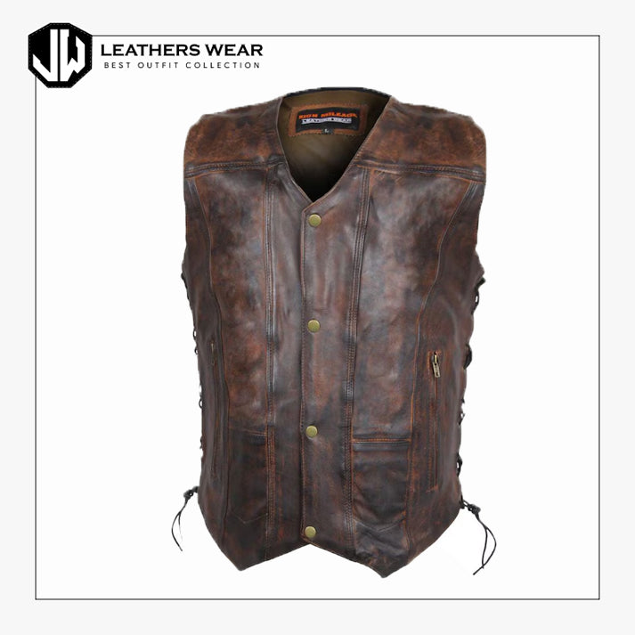 Complete your biker look with the Men’s Vintage Brown Cowhide Leather Vest, crafted from durable full-grain cowhide for a timeless, rugged appeal. Perfect for riding or casual wear, this vest offers comfort, style, and functionality in one versatile piece.