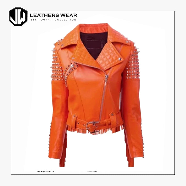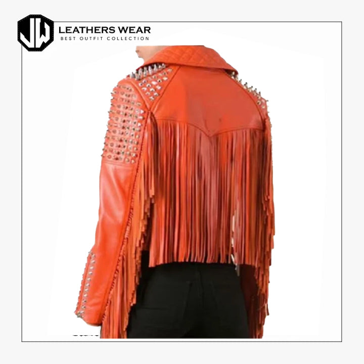 Orange Fringes Studded Leather Jacket