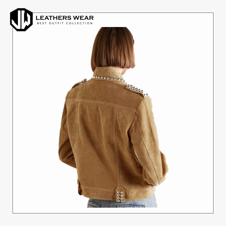 The Women’s Brown Suede Studded Leather Jacket is the ultimate fusion of luxury and edginess. Its distinctive style will ensure you stand out while keeping your wardrobe versatile and timeless.