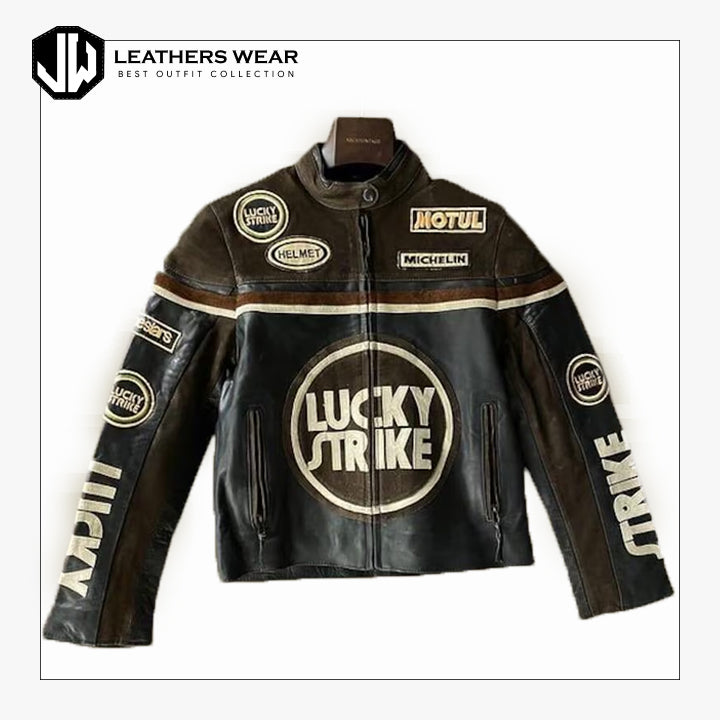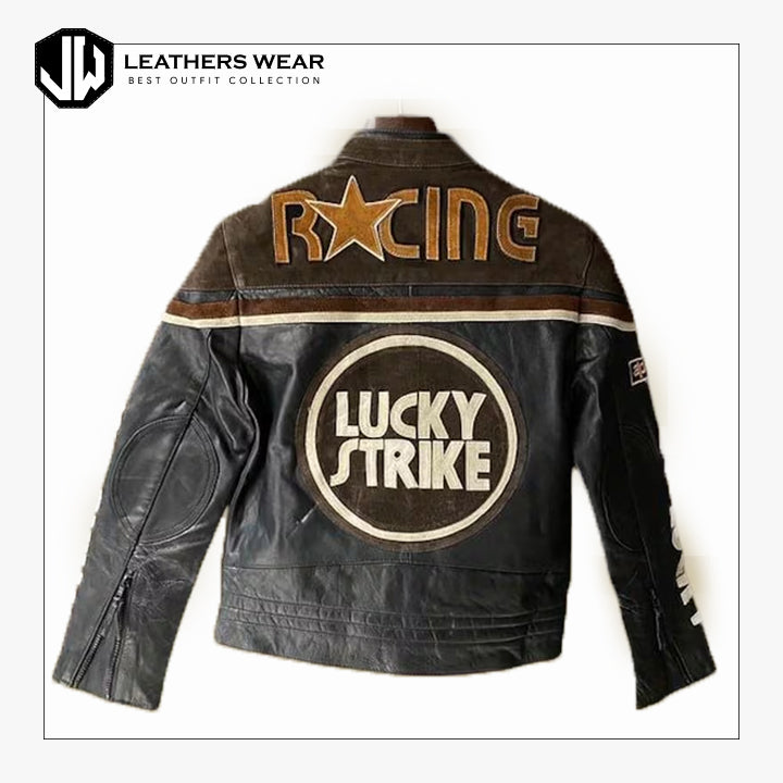 Gear up in racing legend style with our Lucky Strike Racing Leather Jacket, inspired by classic MotoGP gear. Crafted from high-quality genuine leather, this jacket features bold Lucky Strike branding, padded shoulders, and a sleek fit that captures the thrill of the track in everyday fashion.