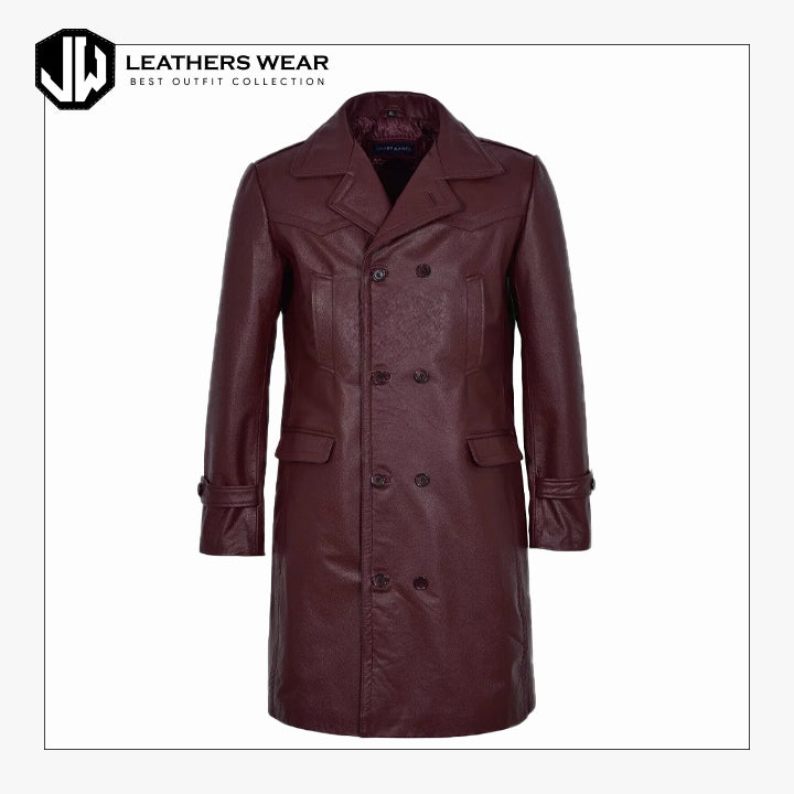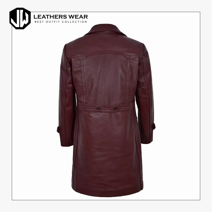Step up your outerwear game with the Men's Burgundy Military Style Trench Coat. Designed for those who appreciate a refined, commanding presence, this trench coat combines the boldness of military design with the elegance of deep burgundy leather.
