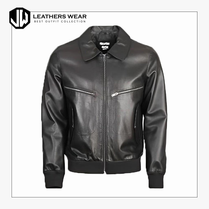 The Mens Sheep Black Bomber Leather Jacket is the epitome of effortless style, combining function with fashion.