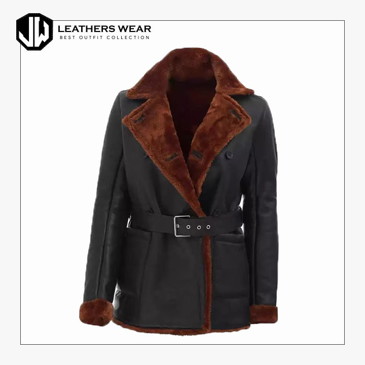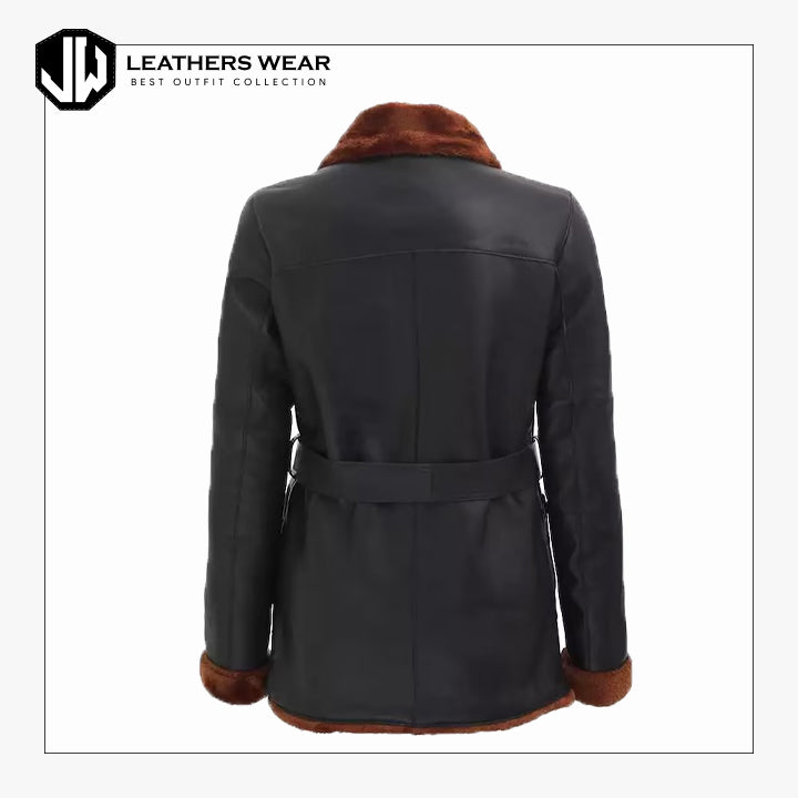 The Women's Black Shearling Belted Coat blends classic styling with modern comfort. Stay warm, stylish, and confident throughout the colder months.