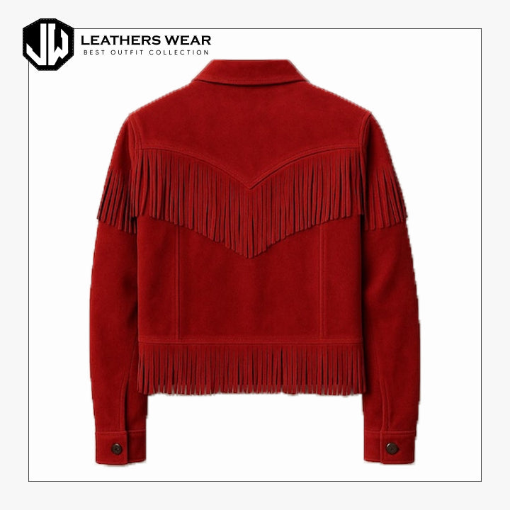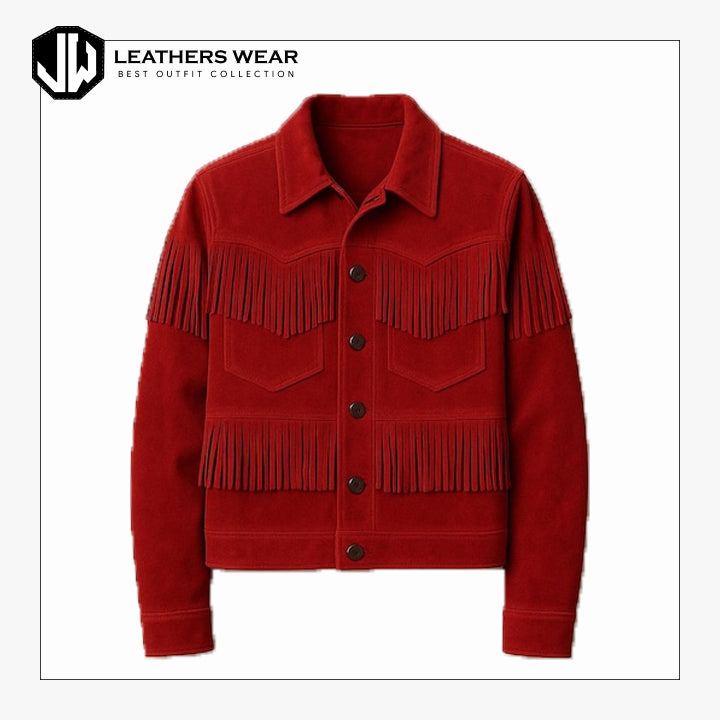 Make a fearless fashion statement with our Red Suede Western Fringe Jacket — a striking blend of old-school Western flair and bold, modern style. Made from soft suede leather and detailed with classic fringe and shoulder yokes, this jacket is built for cowboys, artists, and bold personalities alike.