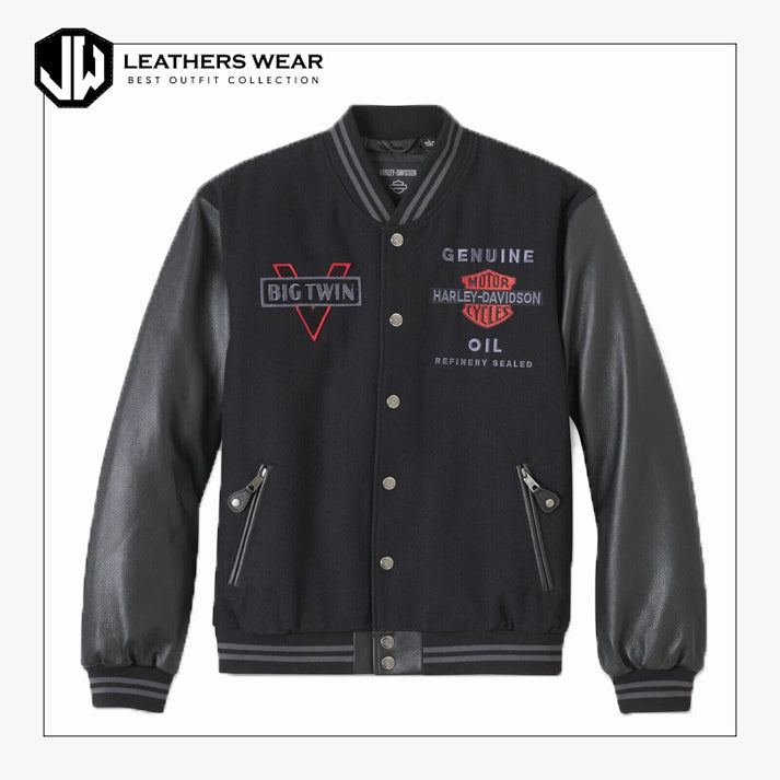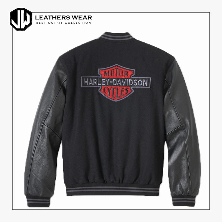 The Harley-Davidson Varsity Leather Jacket blends iconic biker heritage with vintage varsity style. Crafted from premium cowhide leather with wool blend or contrasting sleeves, this jacket offers both statement fashion and functional warmth—ideal for collectors and daily riders alike.